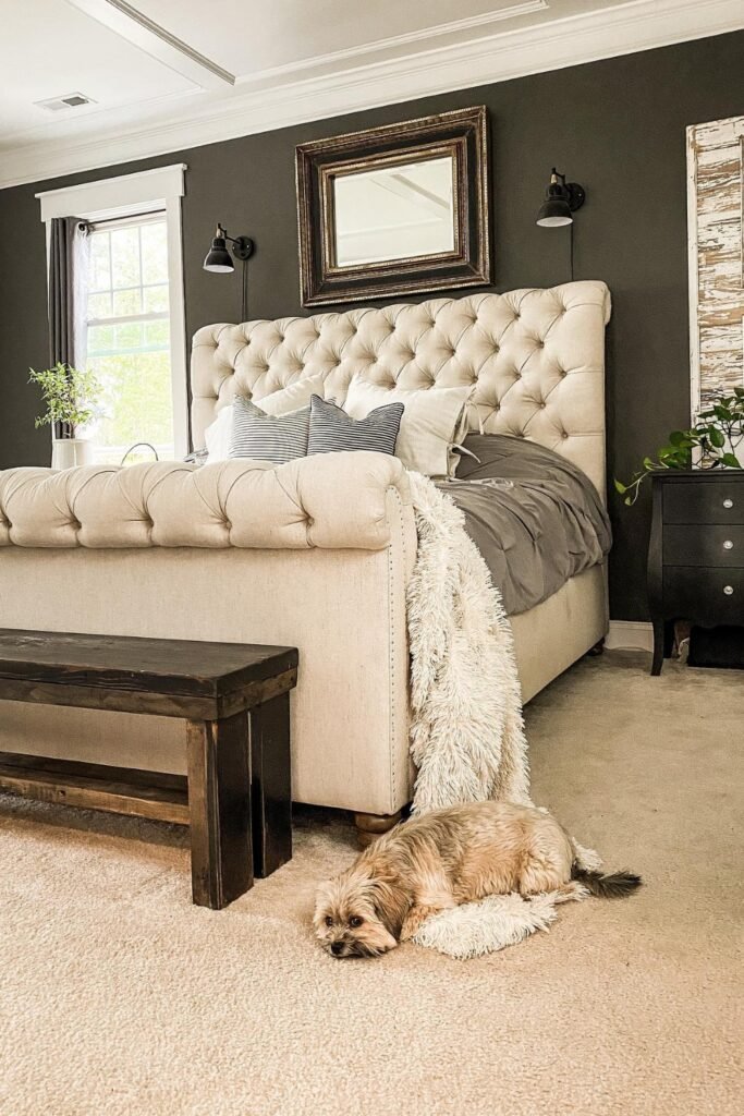 You can see how that tufted cream bed instantly lightens the Urbane Bronze backdrop and keeps the room inviting.