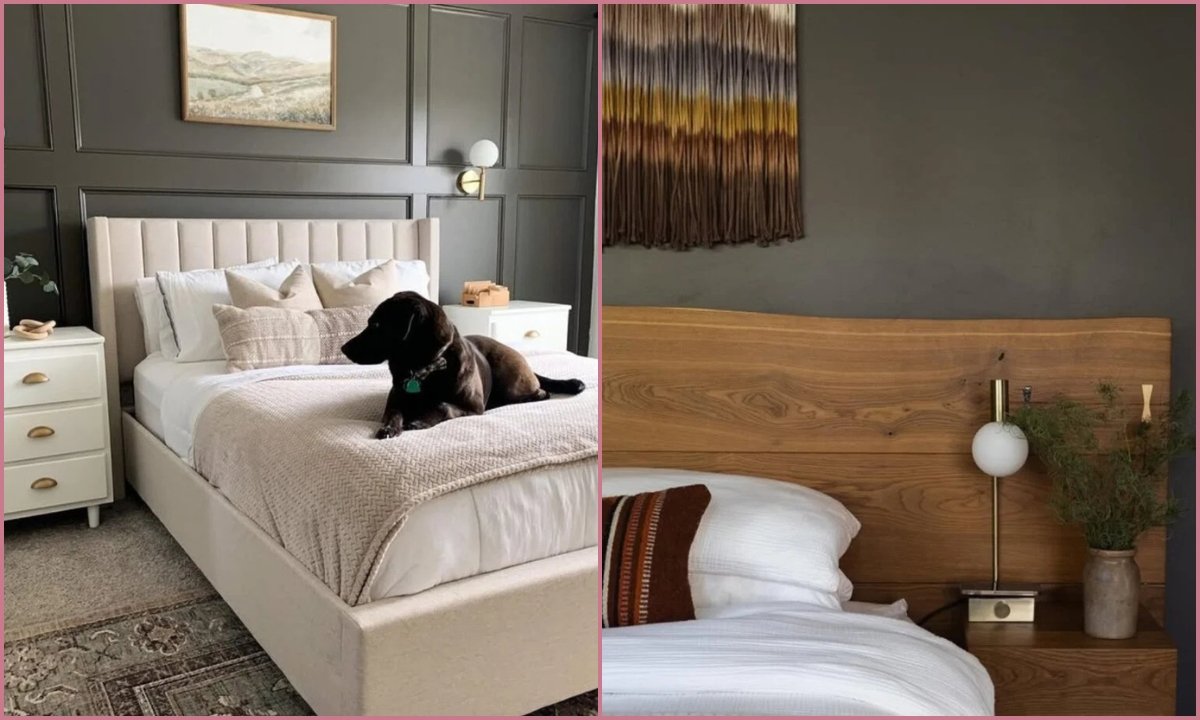 You can see how that warm walnut headboard against Urbane Bronze keeps the room grounded instead of gloomy.