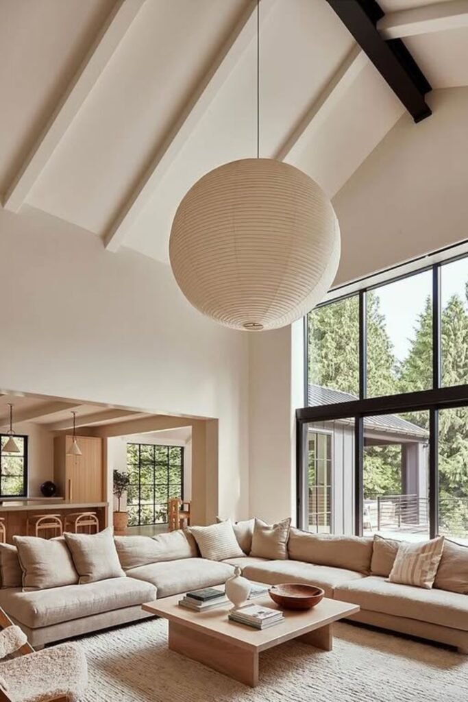 The oversized pendant and expansive windows create a sense of openness, while plush seating and subtle textures bring comfort and effortless modern elegance.