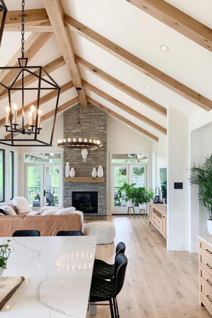 This open-concept space combines natural wood beams, stone textures, and modern finishes for a warm yet refined look.