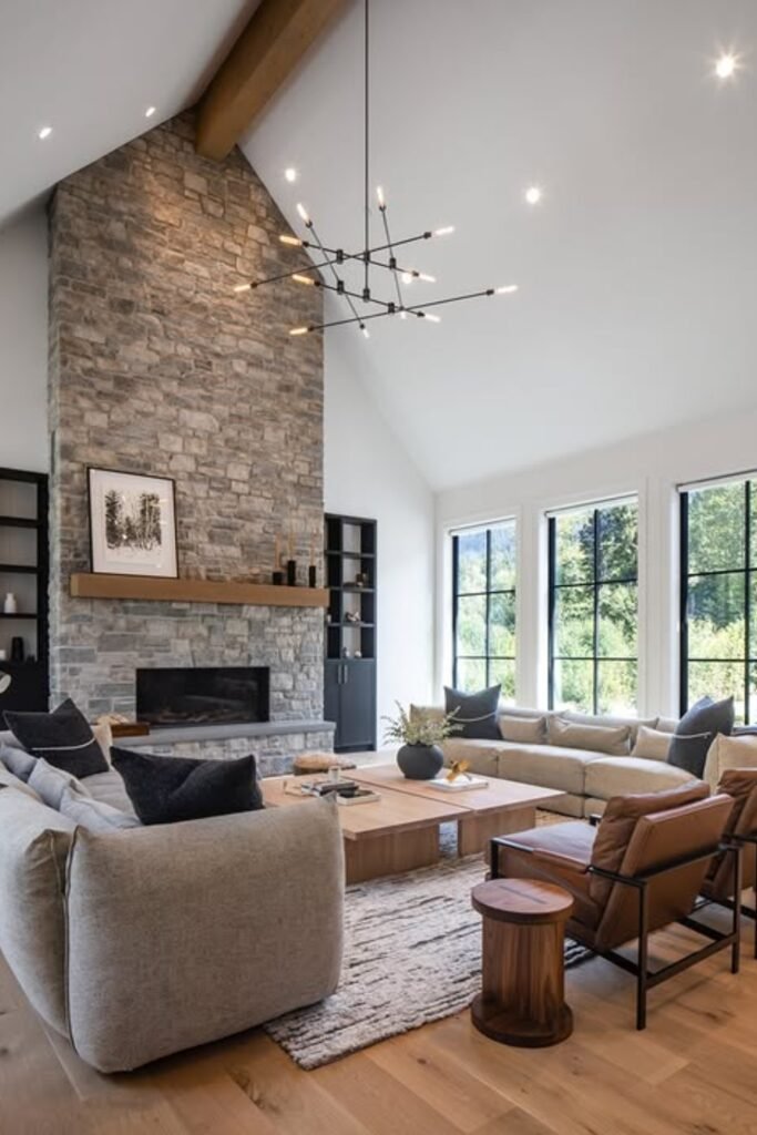 High ceilings and sculptural lighting add sophistication, while cozy seating and warm wood accents create a balanced, inviting atmosphere.