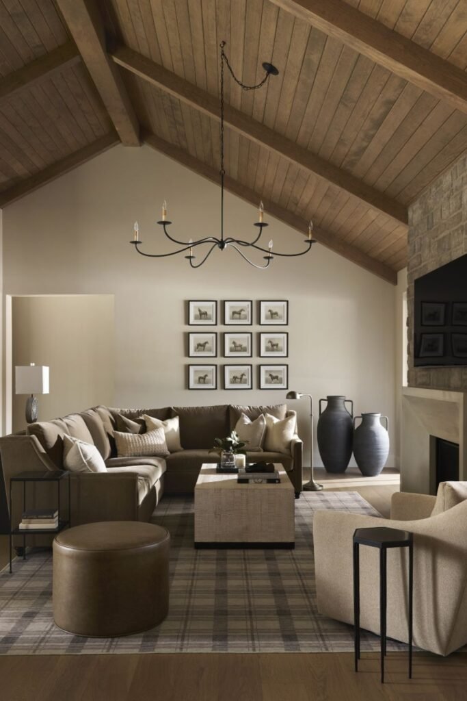 This inviting living room combines rich wood tones, soft neutrals, and timeless textures for a cozy yet refined feel.