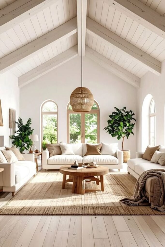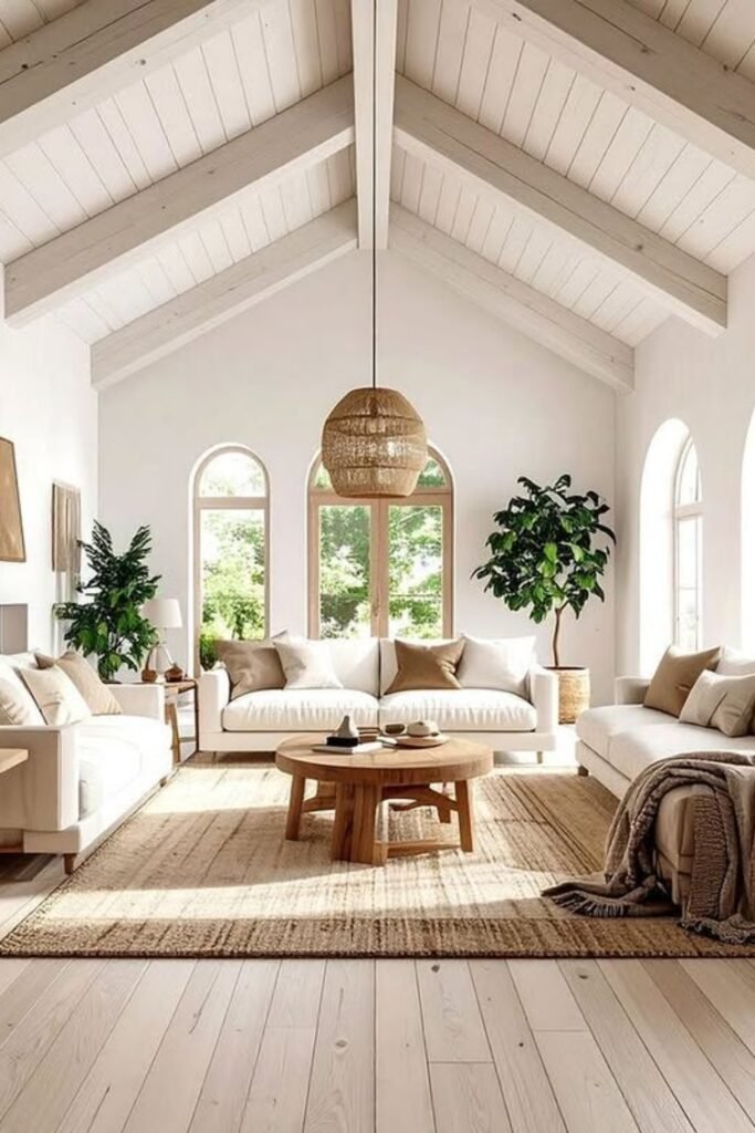 This serene living space features soft whites, natural wood tones, and gentle textures that create a fresh, airy feel.