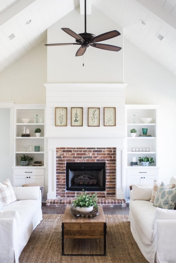 The white palette, brick fireplace, and built-in shelves create a warm yet airy feel, while natural textures and soft accents add comfort and timeless appeal.