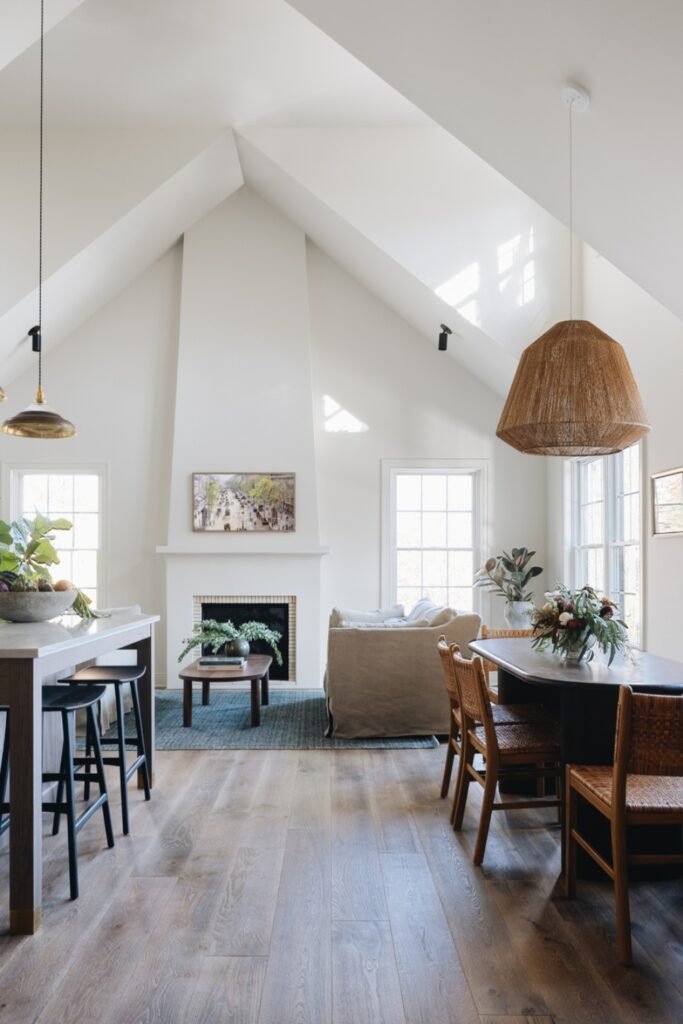 This open space combines bright white walls, warm wood flooring, and natural textures for a relaxed yet refined feel.