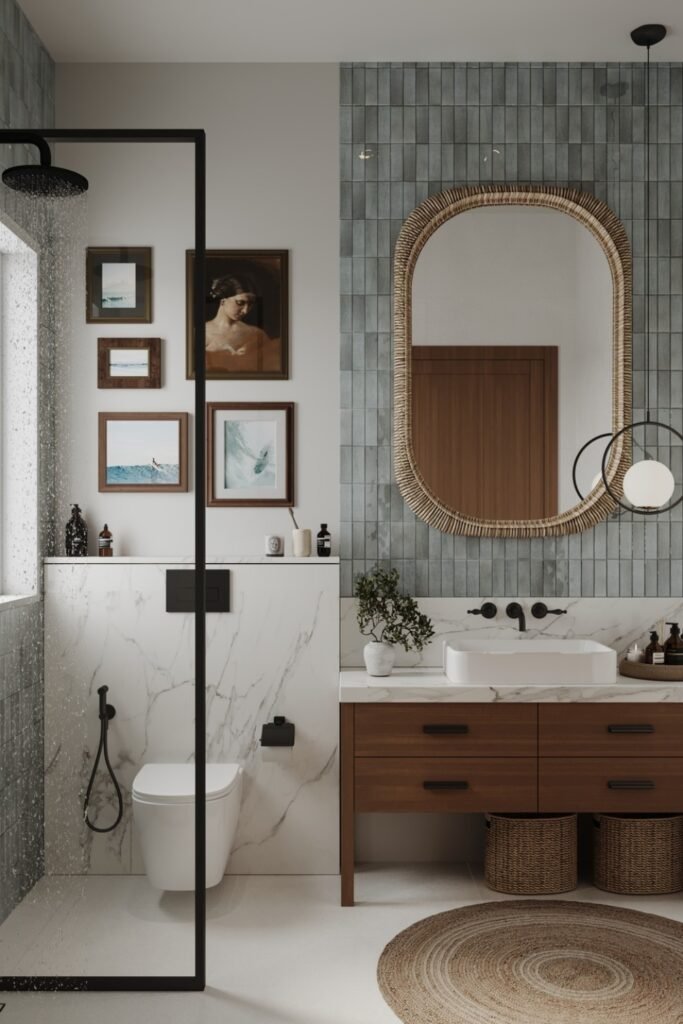 This setup works well when you have a smaller bathroom and you want richness without clutter.
