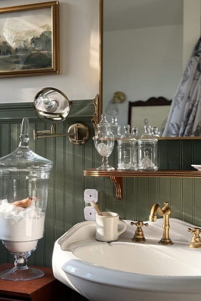 Small choices you make like glass apothecary jars, aged brass taps, or wall paneling, can bring that quiet, old-house feel into even a simple sink area.