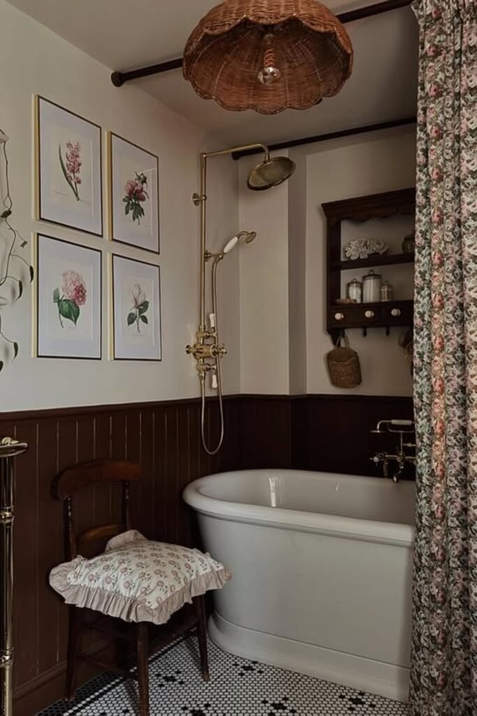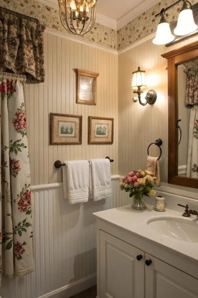 You will notice how floral curtains, beadboard walls, and a classic tub immediately create that cozy feeling.