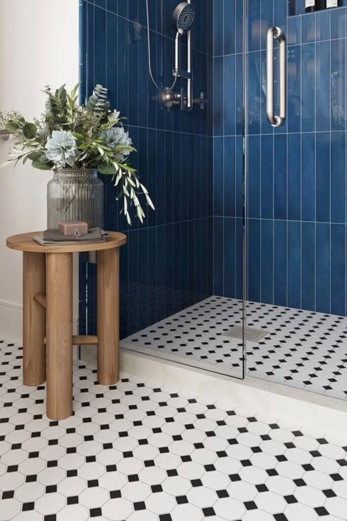 You will notice how the deep blue wall tile gives you a bold vintage backbone, while the hex floor keeps everything grounded in tradition.