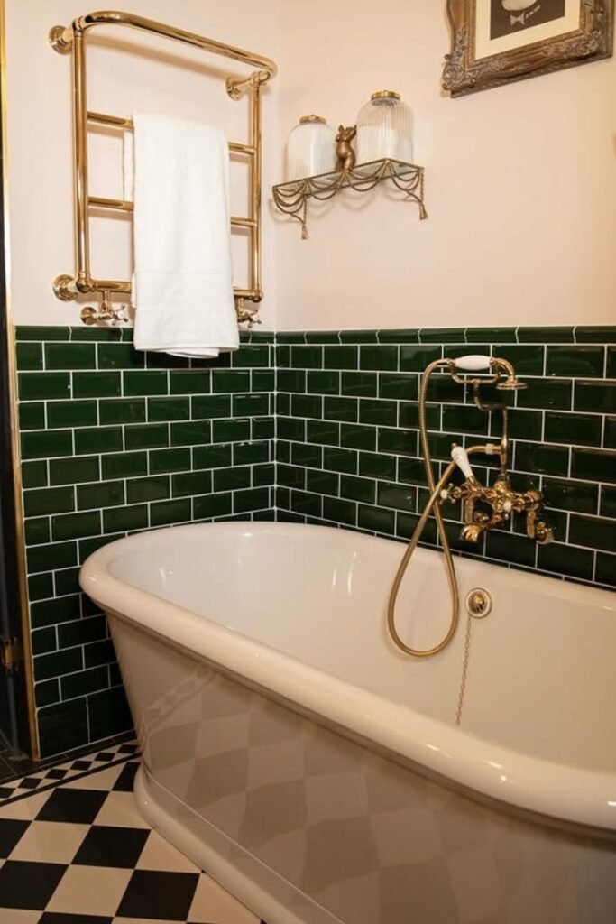 Deep green subway tile gives you instant old-world character, especially when you pair it with warm brass fittings.