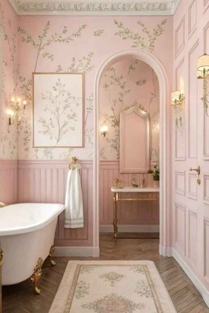 To recreate it, you should start with soft blush tones, add paneling for structure, and then you can bring in brass fixtures and classic shapes so the room feels elegant rather than themed.