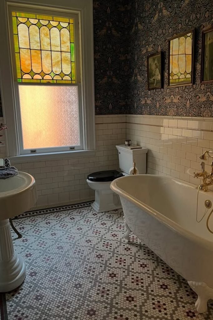 Stained glass can anchor your bathroom in another era before you even notice the tile or fixtures.