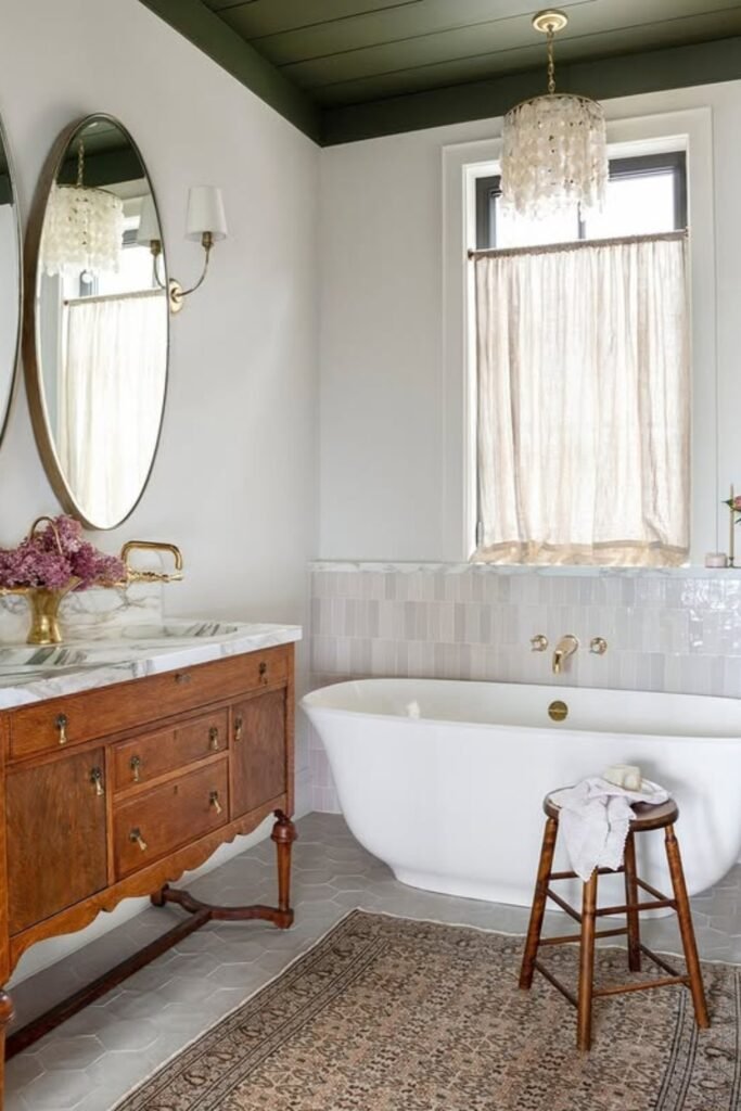 You can see how the clean white tub and soft wall tile keep things fresh, while the wooden vanity and rug bring in age and character.