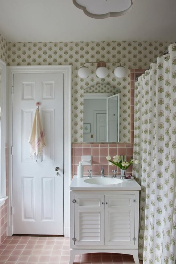 You will notice how pastel tile grounds the space, while patterned wallpaper adds personality without taking over.