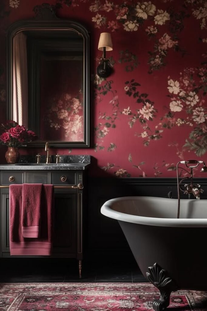 You can pair bold walls with a dark vanity, classic brass fixtures, and a freestanding tub.