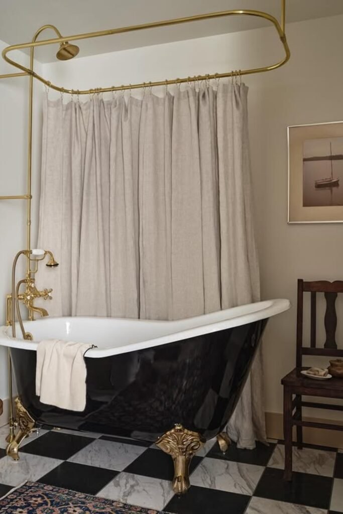 A ceiling-mounted curtain rail lets you add privacy without breaking the old-house feel, especially if you don’t have a built-in shower.