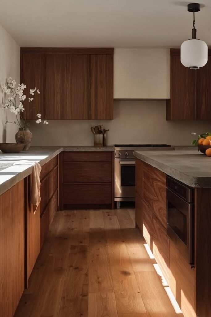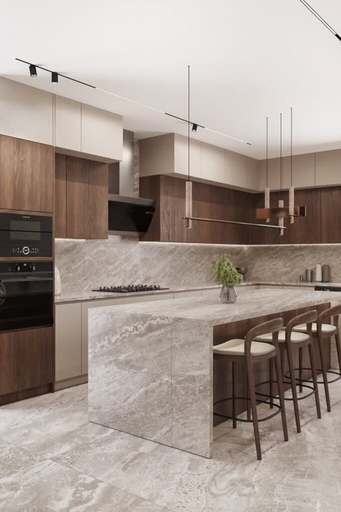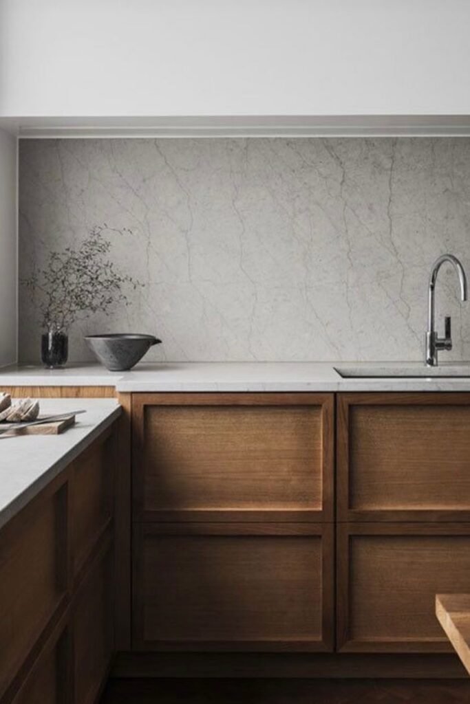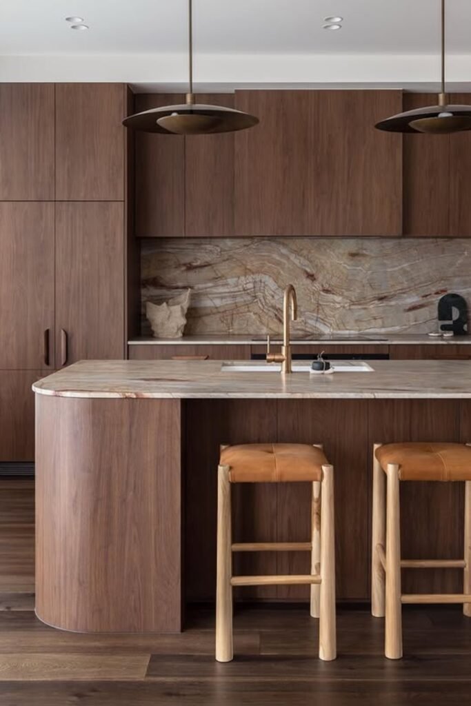 This works especially well when you’re designing a modern or minimalist kitchen and you want warmth without harsh edges.