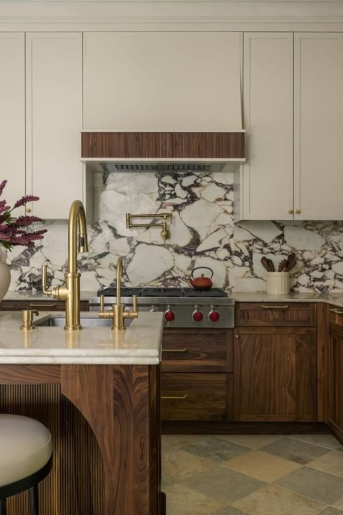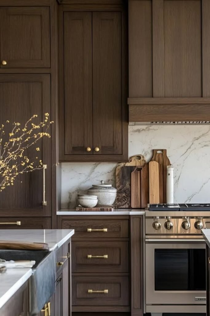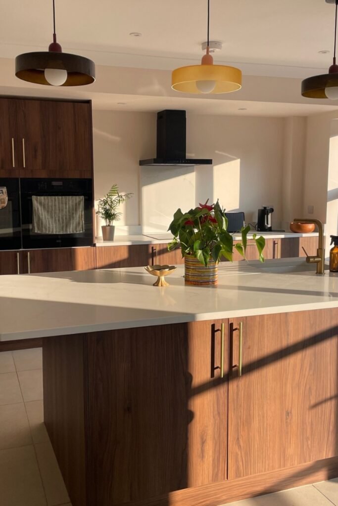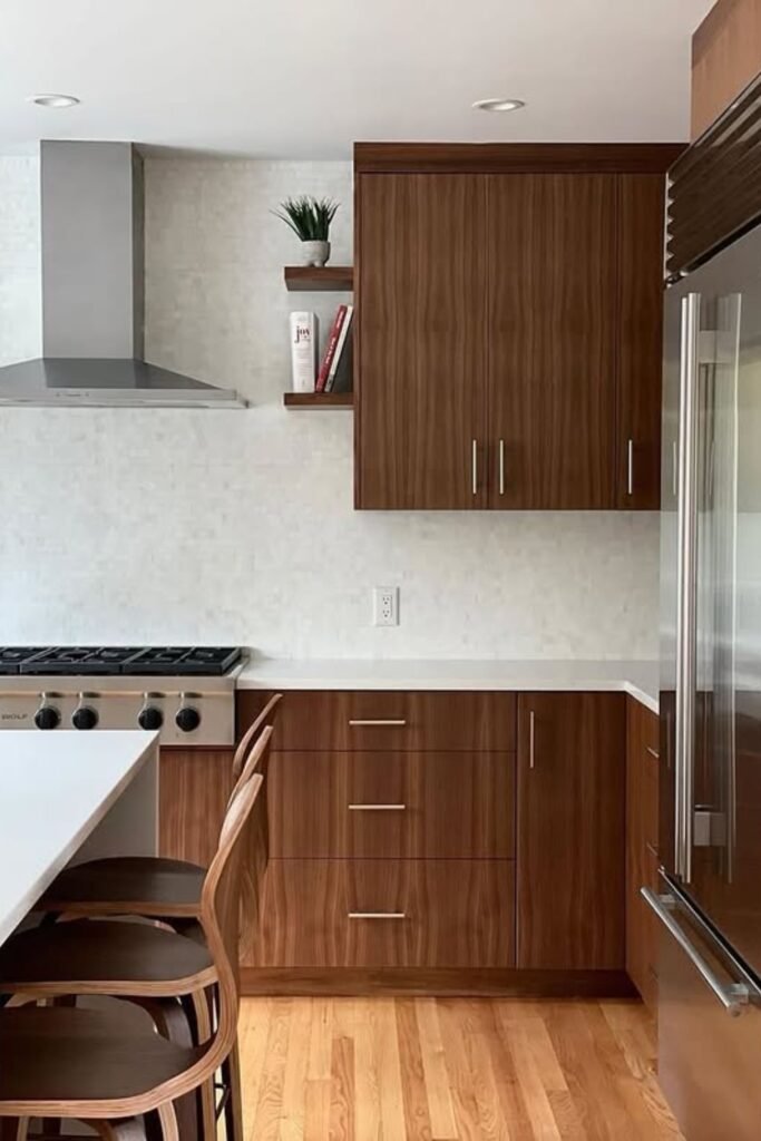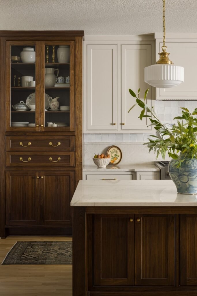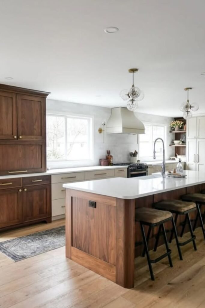 When you use walnut on just the island or lower cabinets instead of everywhere, you’ll see how the space stays warm without feeling heavy.