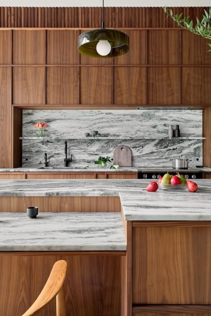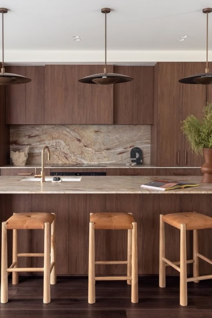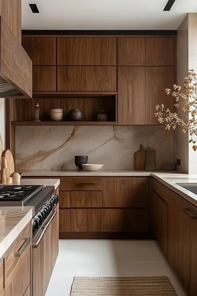 You soften the overall look while still letting walnut stay in the spotlight. The light stone countertop helps brighten the center, so the wood never feels overpowering.