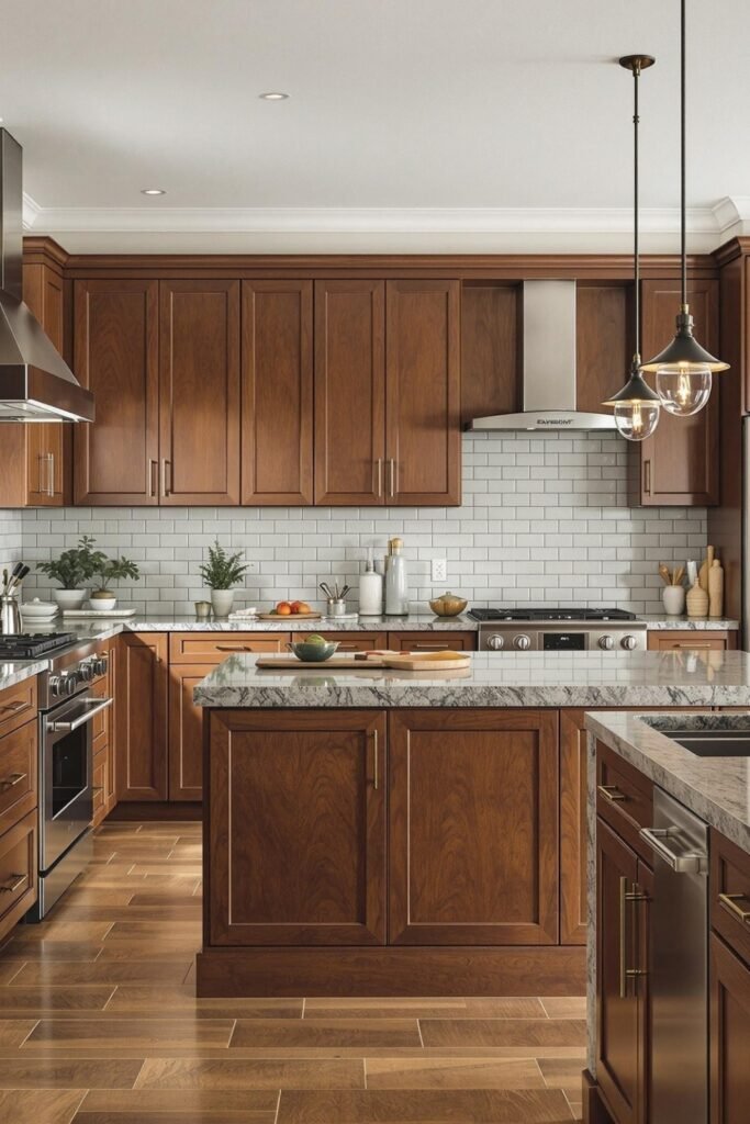 You should pair walnut with a simple white backsplash, you can choose counters with light movement, and you’ll want warm lighting so the space feels classic, not dated.