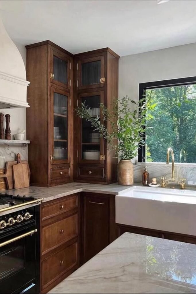 The farmhouse sink, marble counters, and warm brass fixtures keep the wood from feeling heavy or formal.