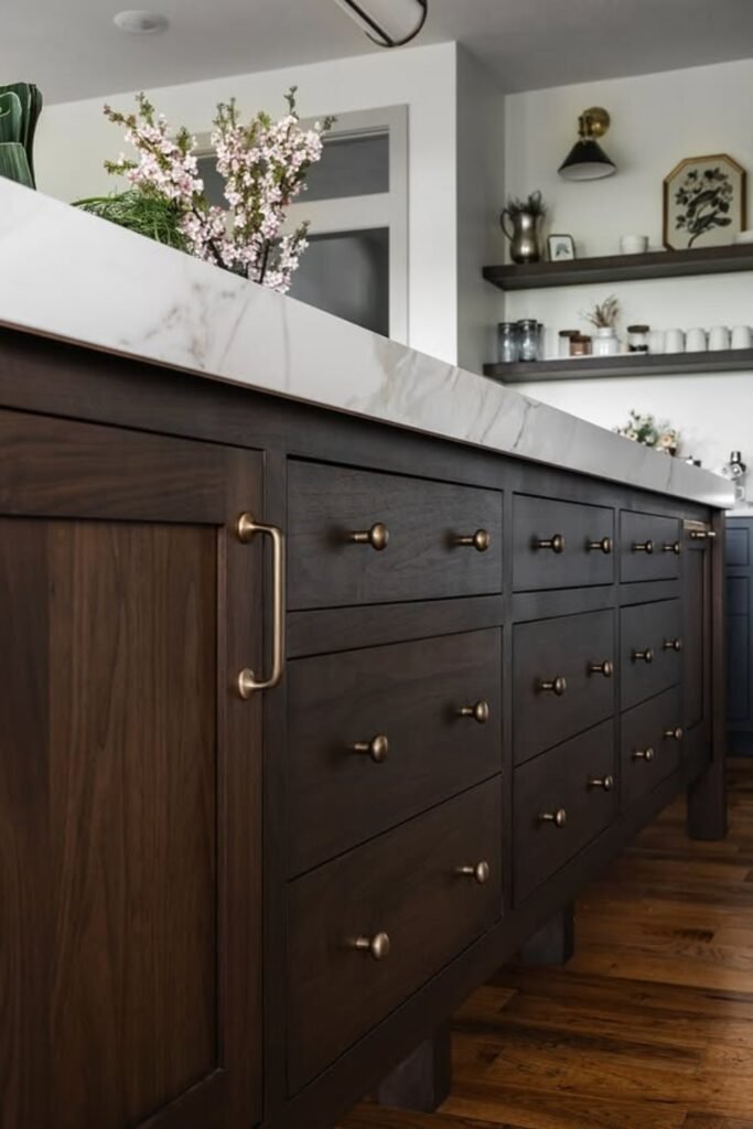 When you add brass hardware, you instantly warm things up without stealing attention. This approach works best when your kitchen leans classic or transitional.