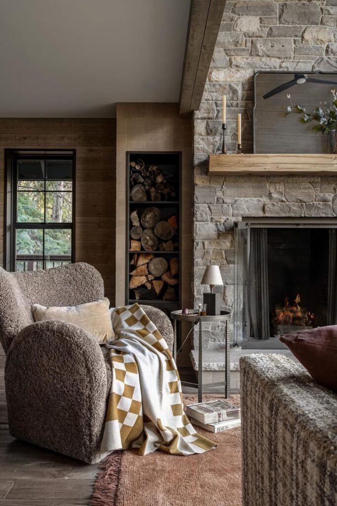 You can mix in natural textures, stacked firewood, and classic wooden chairs, and you will instantly feel that cozy cabin atmosphere without making it feel overly styled or modern.