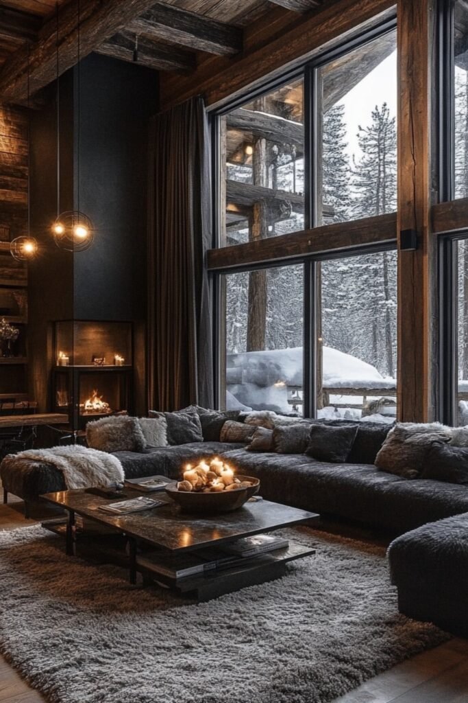When you work with deep wood tones, oversized windows, and soft layered textures, you can create an intimate cabin atmosphere.