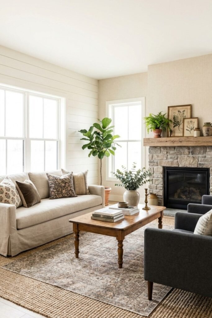 You can layer soft neutral upholstery and subtle greenery, and you will instantly feel how cozy the space becomes.