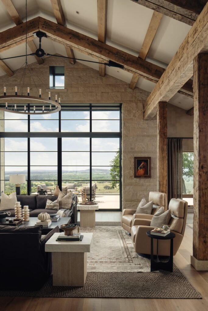 If you want a dramatic yet inviting rustic living room, you can blend soaring wood beams and textured stone walls with expansive black framed windows.