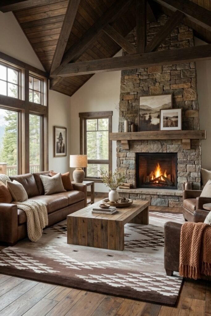You can capture timeless rustic charm by working with exposed wood beams, a stone fireplace, and rich leather seating.