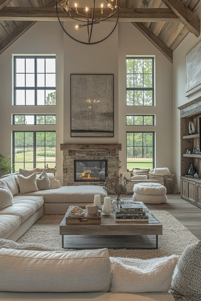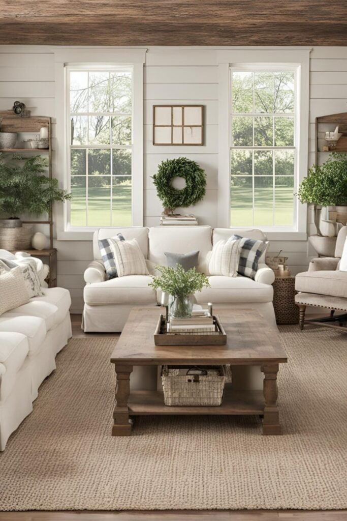 When you add large windows and neutral tones, you will see how bright and open the room feels perfectly balancing cozy farmhouse charm with a relaxed, modern vibe.
