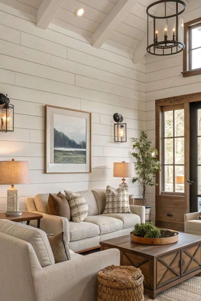 You might pair creamy shiplap walls with natural wood trim and rustic lighting, and you will feel a soft, welcoming atmosphere instantly.