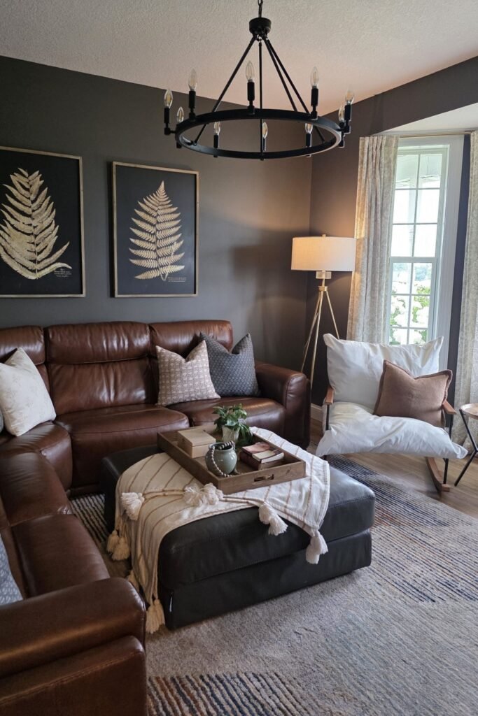 If you want a grounded, cozy feel, you can start with a deep charcoal accent wall and rich brown leather seating.