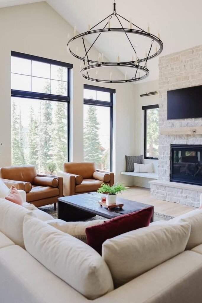 You can combine light stone textures and expansive black-framed windows with warm leather chairs to give your room a fresh rustic look.