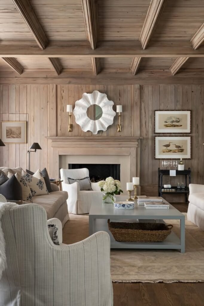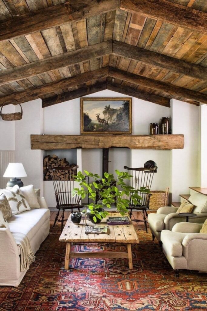 You might want to bring true rustic character into your living room, and you can do it with exposed reclaimed wood beams and a thick timber mantel that anchors the space.