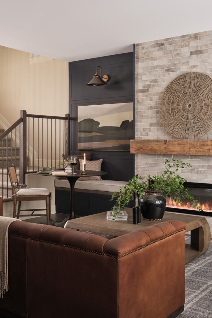 You can bring in a dark sectional and a plush rug to feel comfort instantly, while warm pendant lighting and a glowing fireplace enhance the cozy mood.
