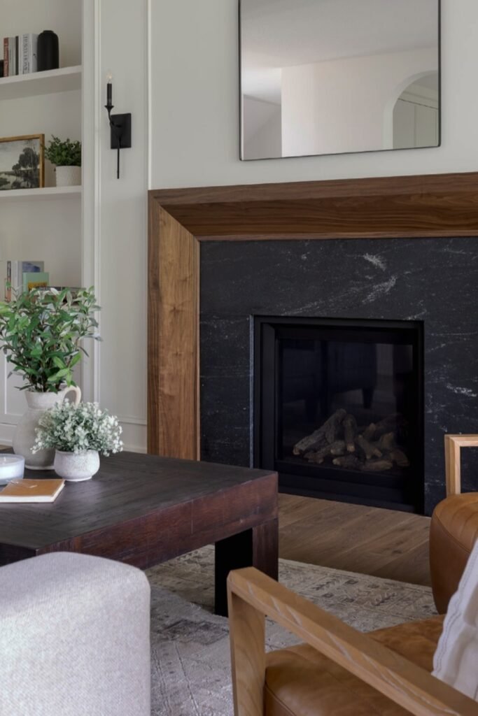 You might add a thick wood mantel and a leather sofa so you can feel warmth and texture immediately.