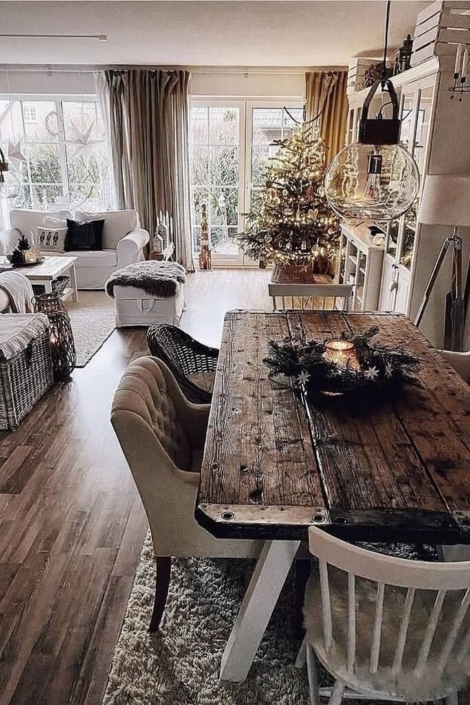 If you want a space that blends rustic charm with soft farmhouse elegance, you can start with a reclaimed wood dining table, woven textures, and warm neutral tones.