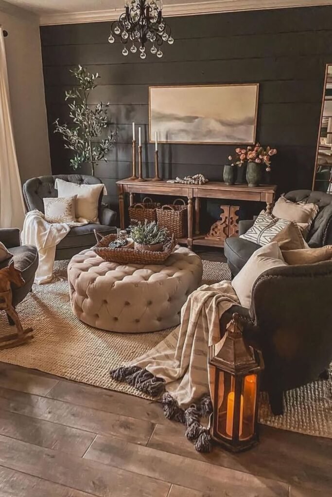 You’ll find that balancing dark tones with warm neutrals can make your space feel intimate, grounded, and effortlessly inviting.