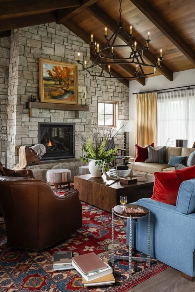You can combine a stone fireplace with dark wood ceiling beams and bold textiles to create a warm, inviting living room.