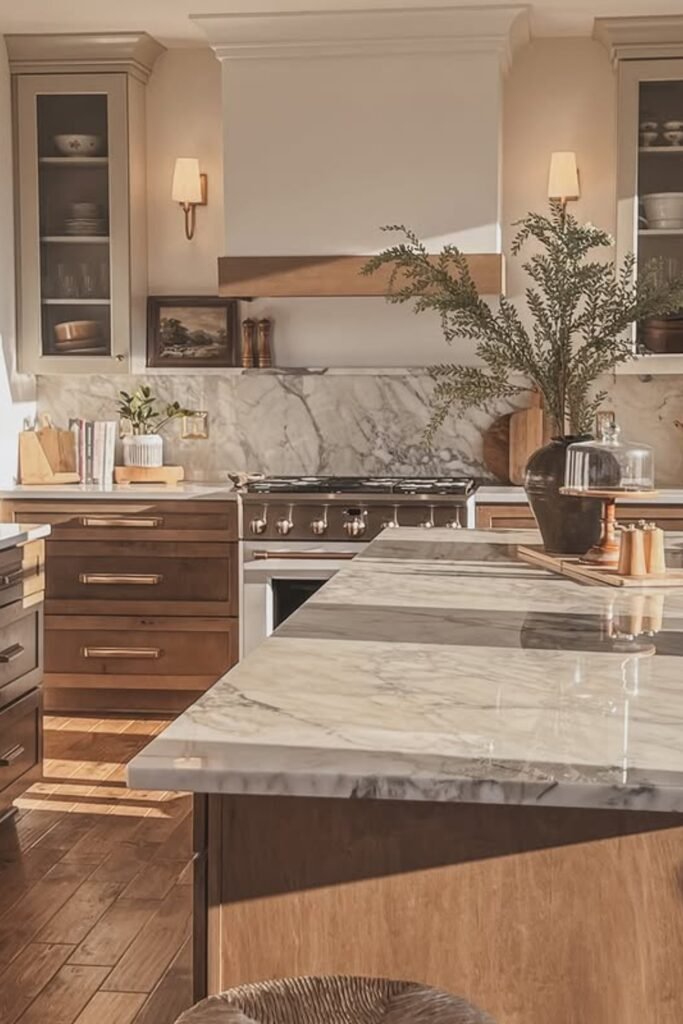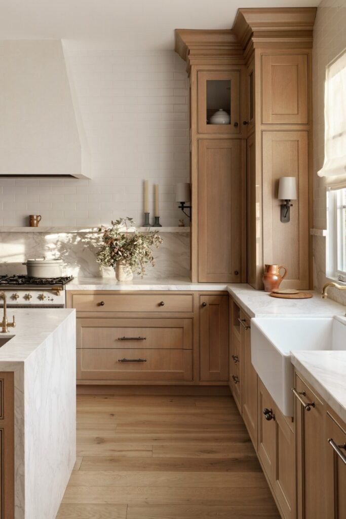You should choose a soft wood tone with subtle grain, pair it with pale stone, and keep details traditional but restrained so nothing feels overdone.