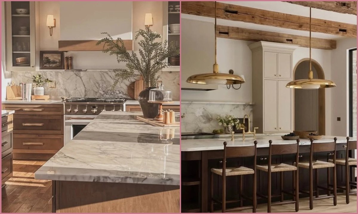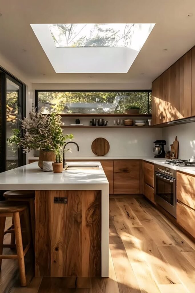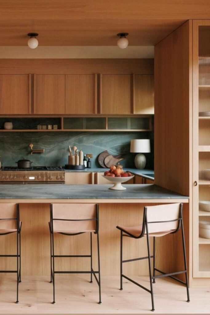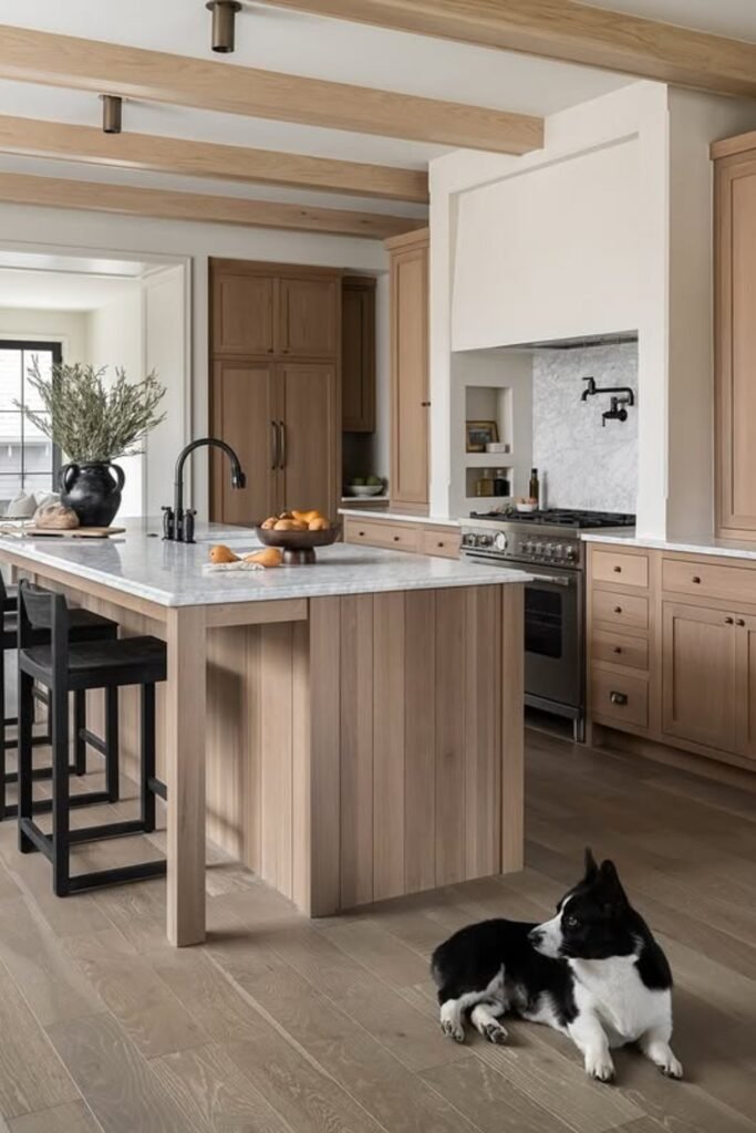 What keeps this kitchen feeling light is how you break up the wood, not how much you use. This works best if you have a larger kitchen and want structure without clutter.