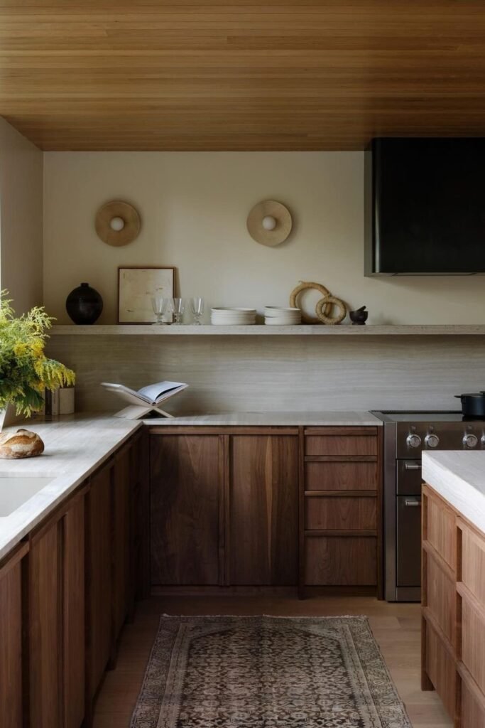 The wood feels rich, but you don’t let it take over, because you balance it with clean stone surfaces and plenty of open space.
