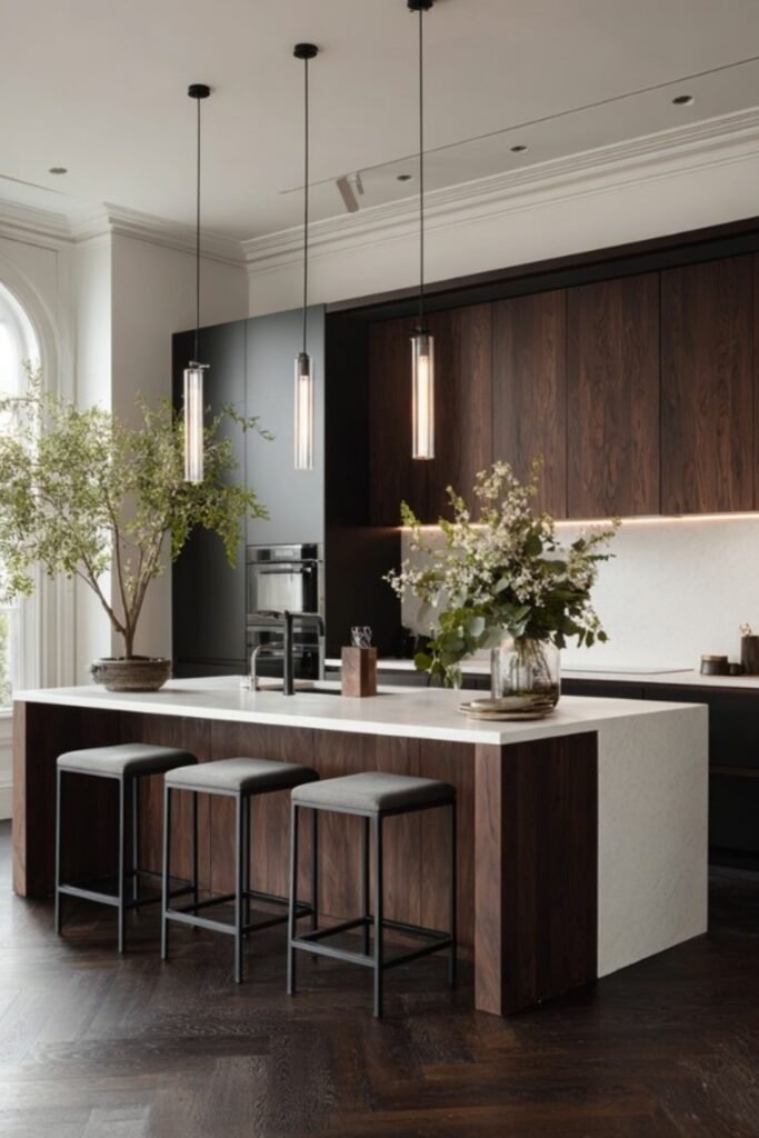 The deep wood adds drama and weight, while the clean stone island keeps it sharp and modern.