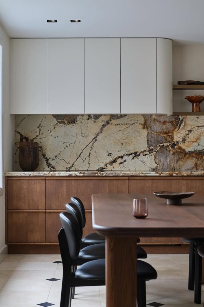 Instead of competing, the wood supports the stone. The rich wood base cabinets ground the space, while a dramatic stone backsplash becomes the main feature.