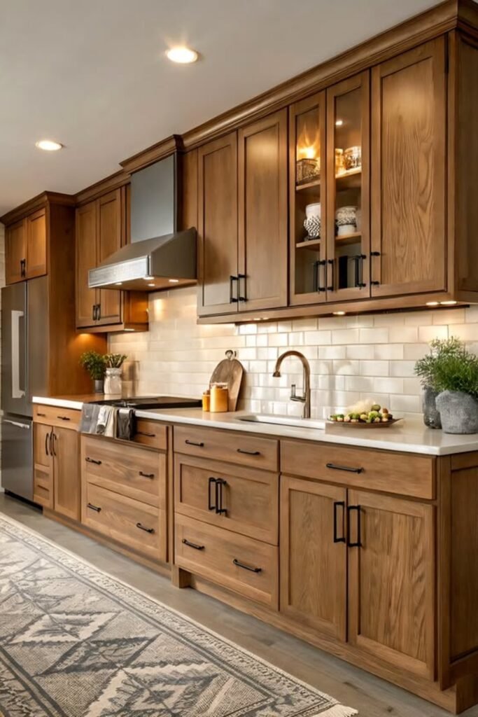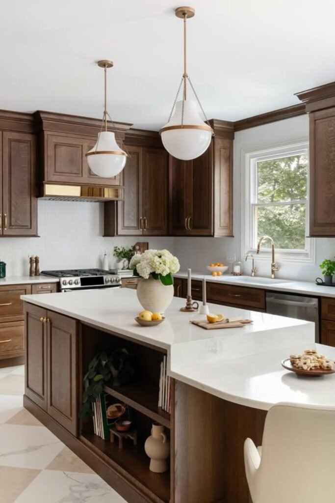 The medium-dark wood adds richness, while the white countertops keep everything from feeling too formal or heavy.