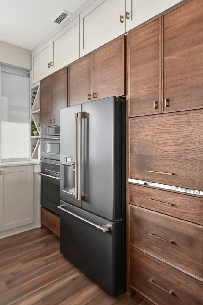 You let darker wood ground the tall storage, while lighter cabinets above help you avoid that boxed-in feeling.
