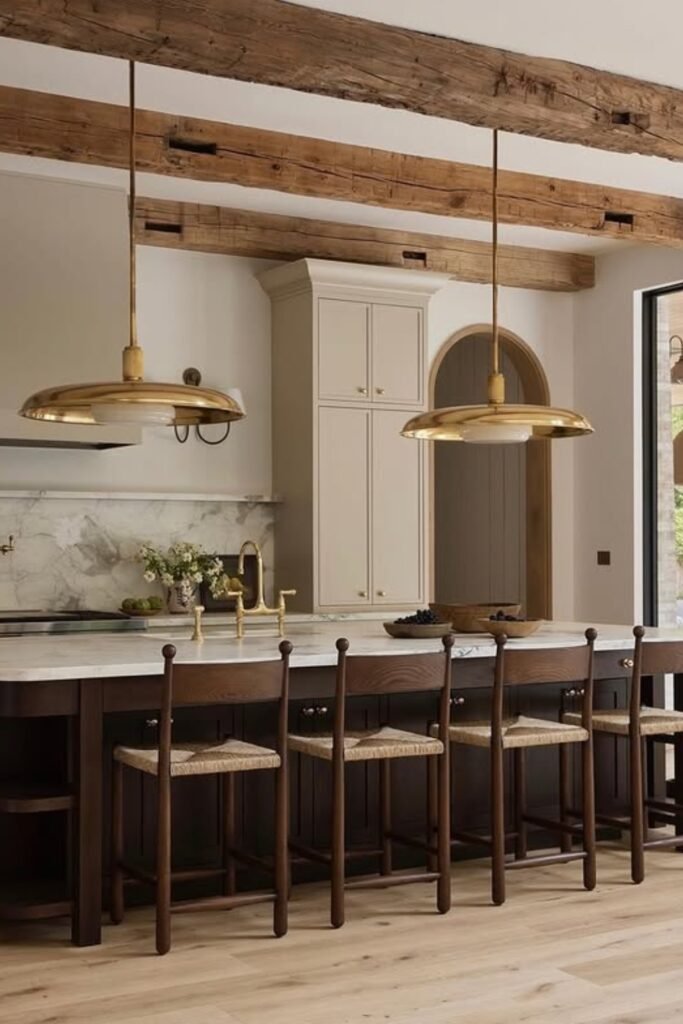 Overhead beams add warmth, while pale cabinets and stone surfaces help you avoid heaviness.
